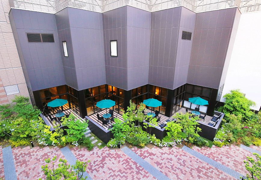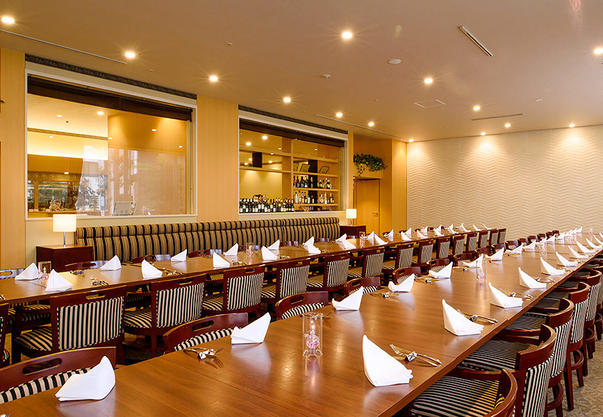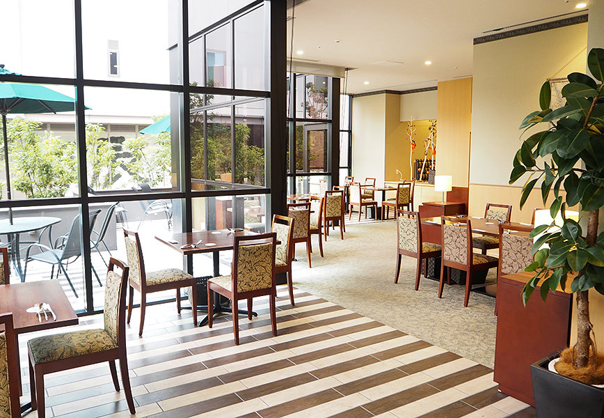 大工町のホテル・ザ・ウエストヒルズ水戸内のレストラン。水戸市街地という便利な立地でありながら、大きく開放された窓から緑も眺めることができる贅沢な作りです。