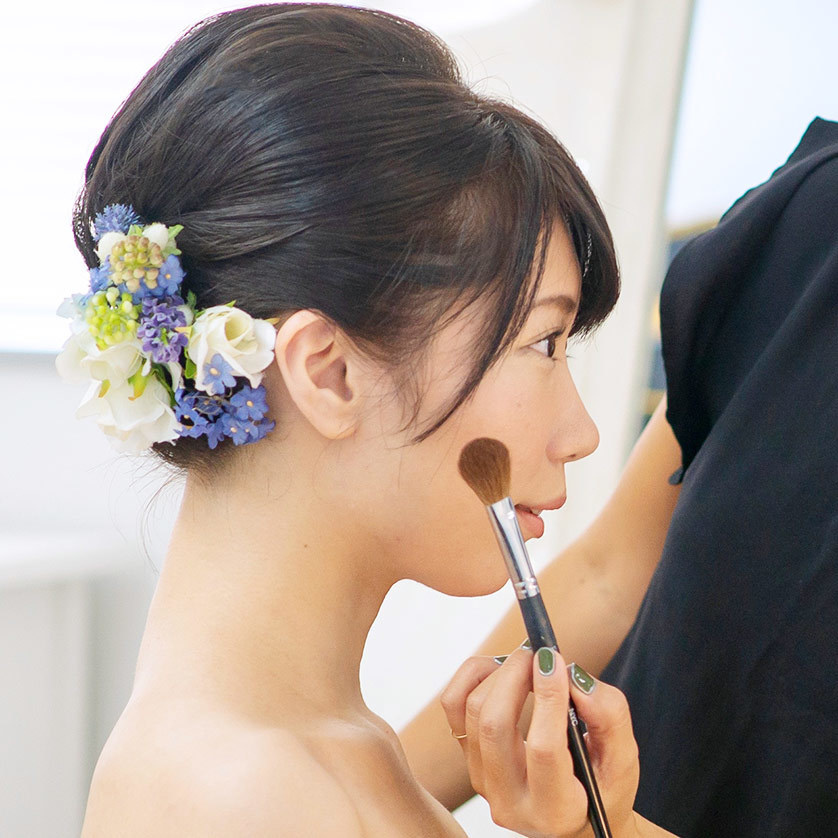 別館スタジオエトワへご来店後、お支度に入ります。ご希望のヘアの写真などがございましたらお持ちください。全体の所要時間は約3時間です。