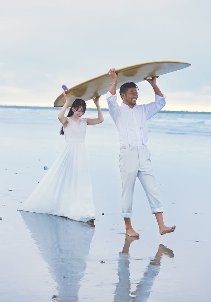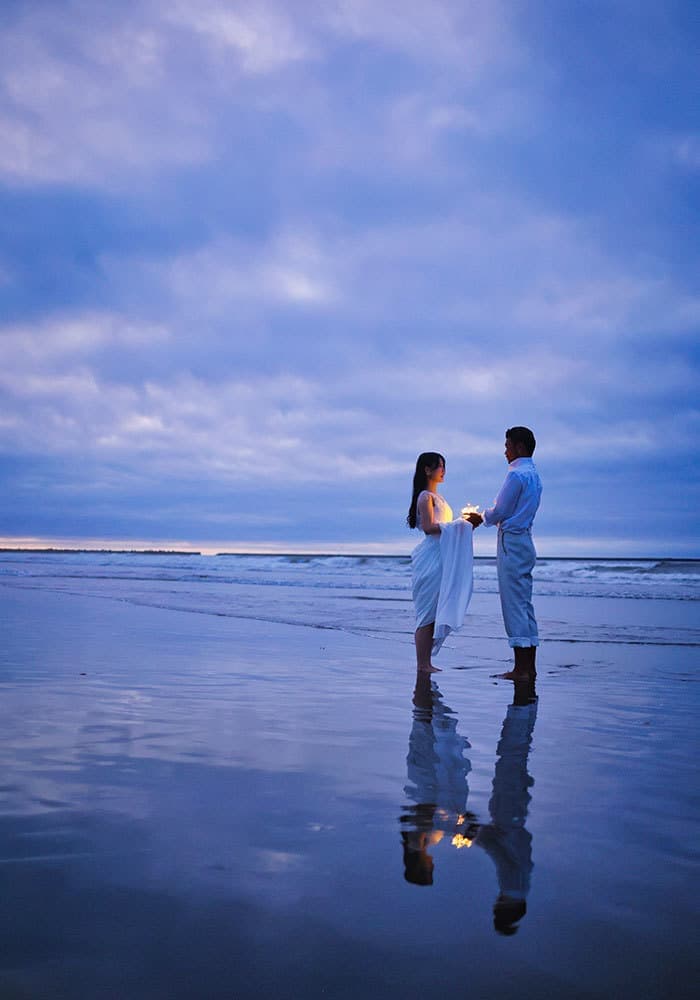 ふたりの影が水面に反射して、「ウユニ塩湖」のような幻想的な写真が撮れます。