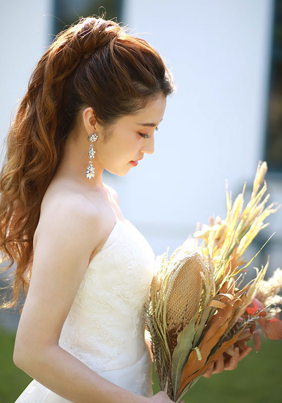 別館スタジオエトワへご来店後、お支度に入ります。ご希望のヘアの写真などがございましたらお持ちください。全体の所要時間は約3時間です。